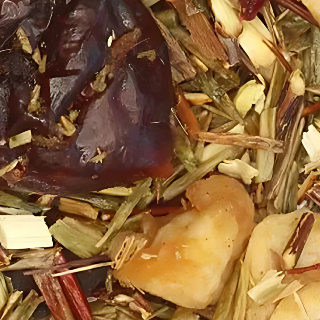 ingredients: green rooibos tea, apple pieces, cinnamon, hibiscus, cranberries, rose hips, natural cranberry flavor, red peppercorn, natural crème flavor